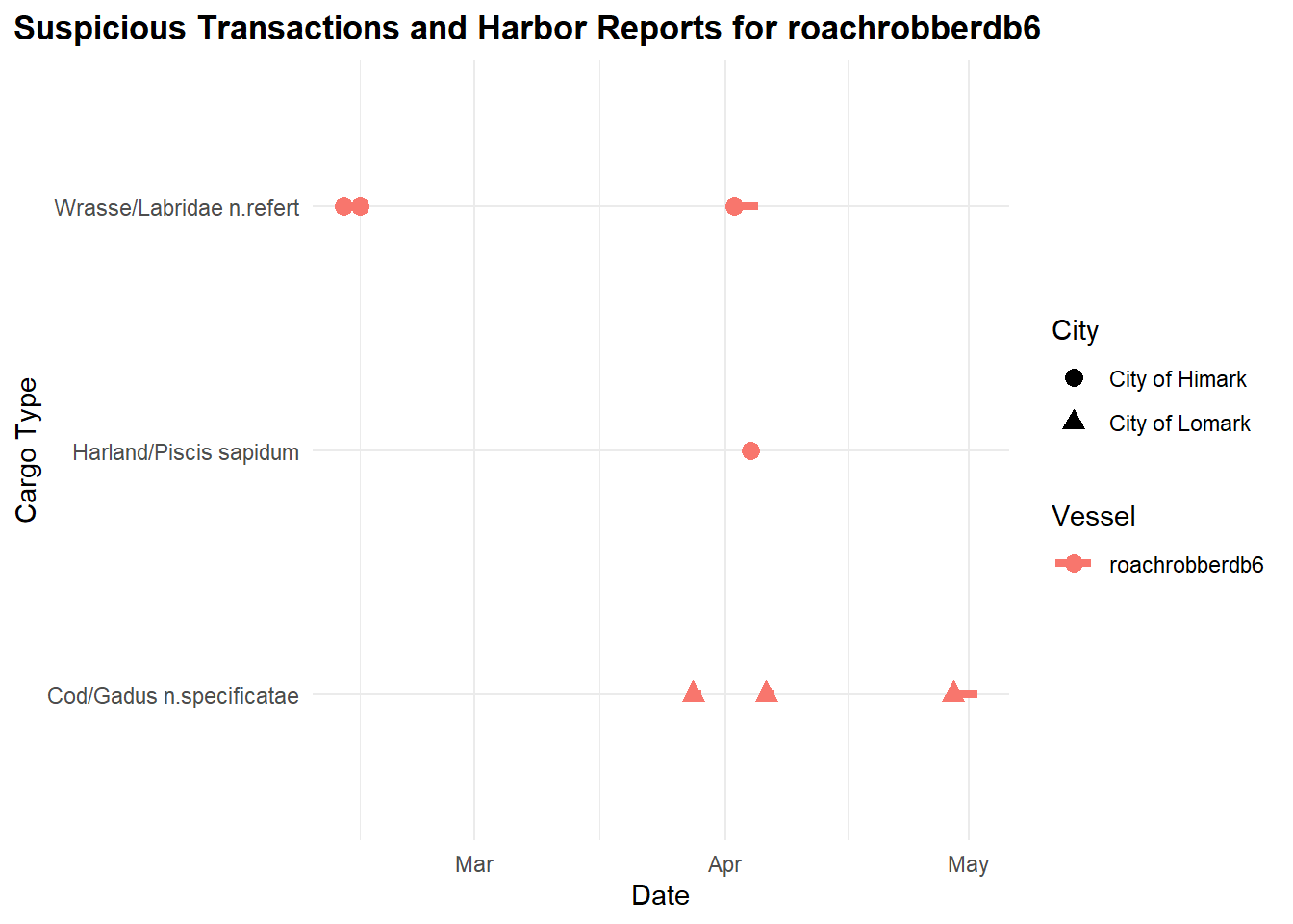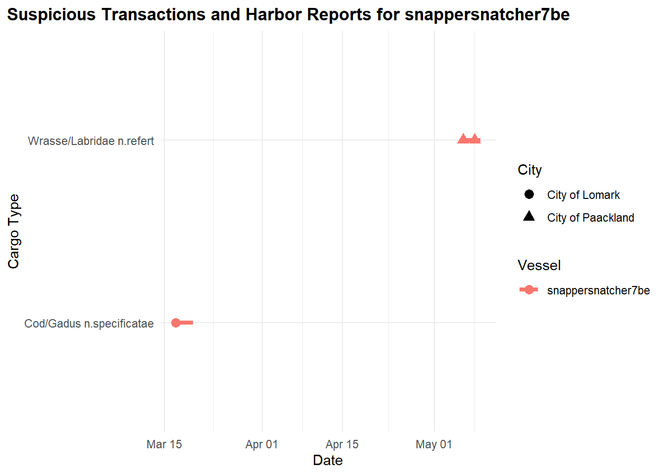 Additionally, we created RShiny visualizations to compare cargo transactions from before and after the capture of SouthSeaFood Corp, aiming to analyze how this event might have affected the fishing patterns of other companies. By analyzing cargo transaction data from periods before and after SouthSeaFood Corp’s capture, we are able to explore whether there have been changes in the types and volumes of fish being transported.