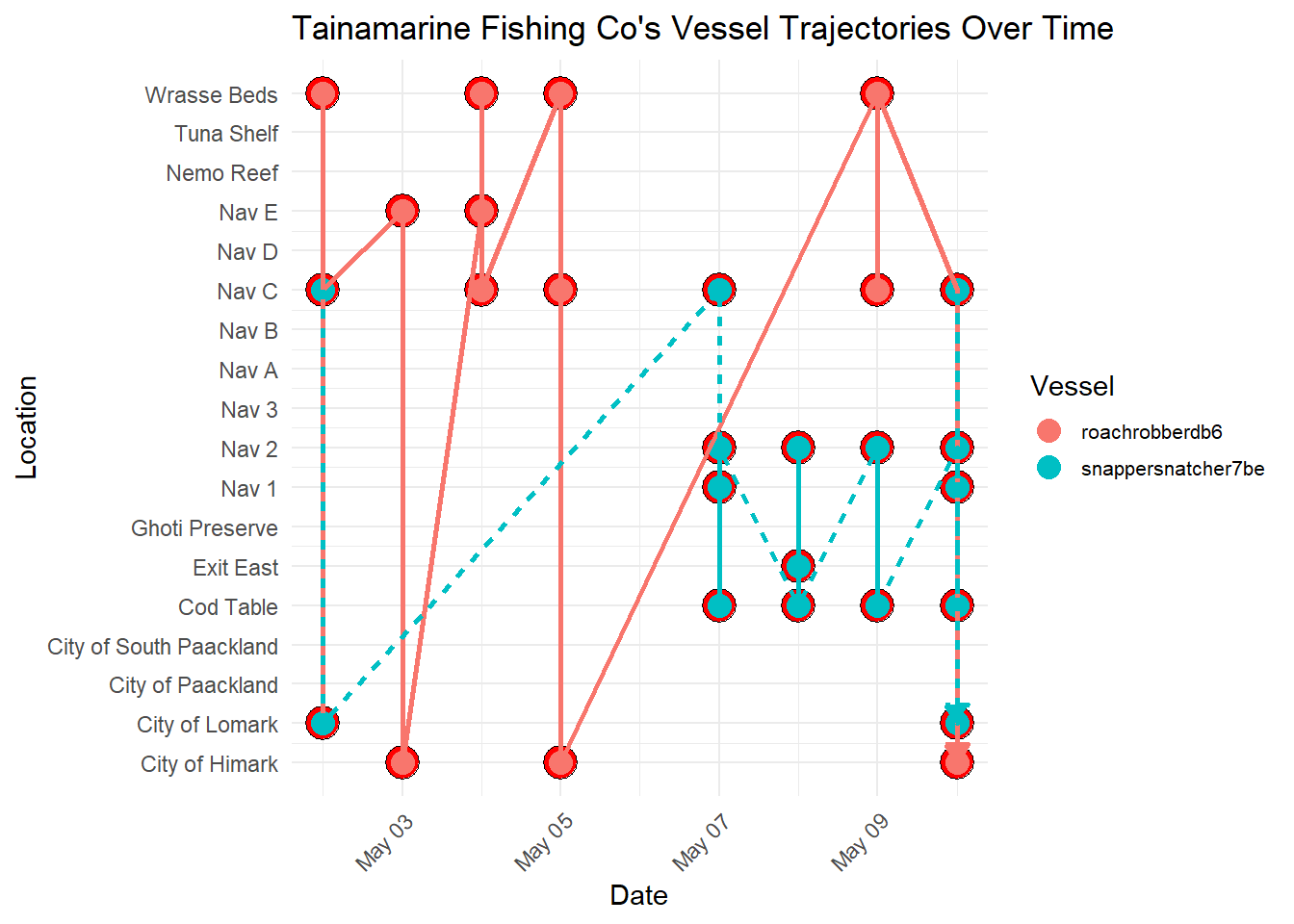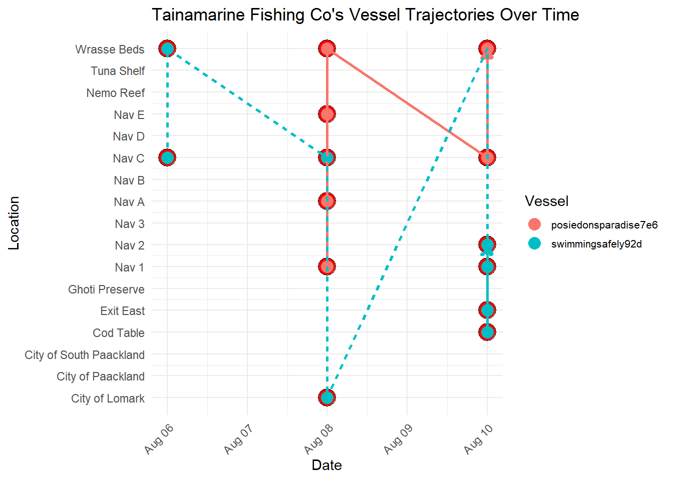 In the next section, we proceeded further to investigate Tainamarine Fishing Co by plotting its vessel trajectories over time. This in turn led to some interesting findings.