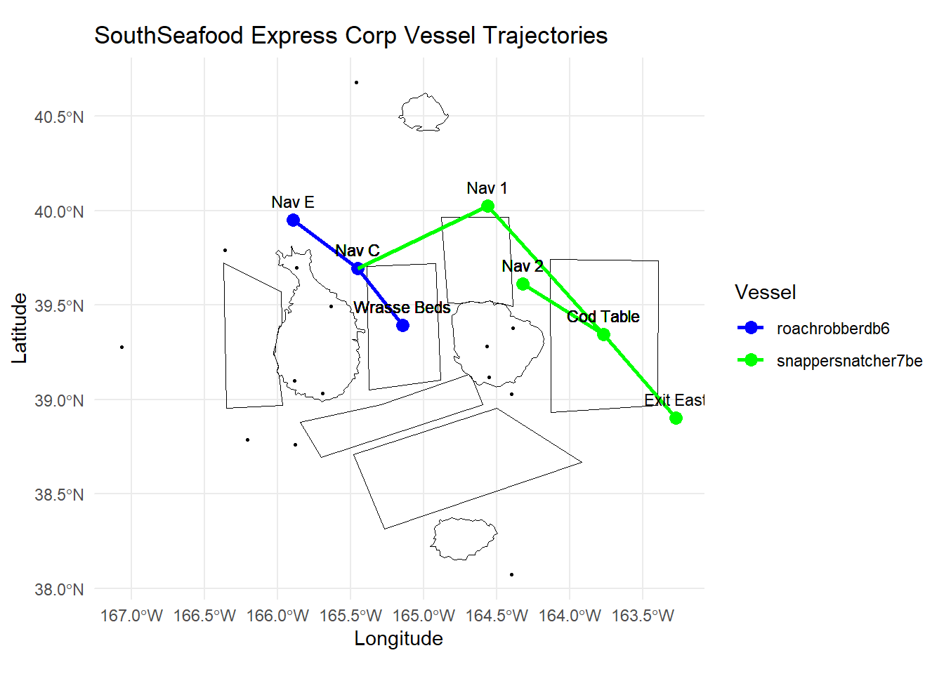 geom_path(data = grouped_data, aes(x = Longitude, y = Latitude, color = vessel, group = vessel), size = 1) + # Plot paths with different colors for each vessel
