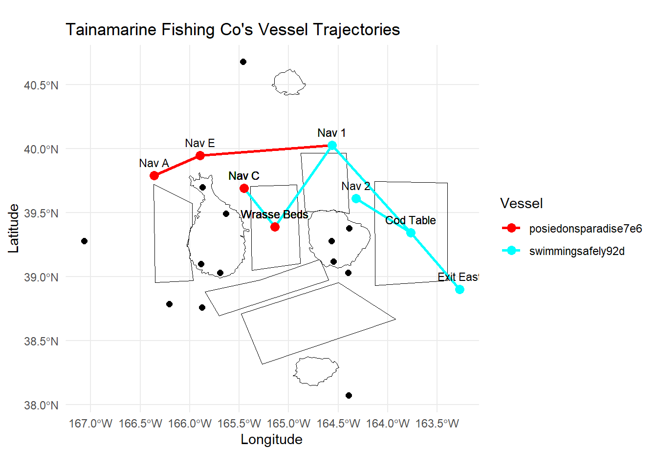labs(x = "Longitude", y = "Latitude", title = "Tainamarine Fishing Co's Vessel Trajectories", color = "Vessel") + # Add legend title