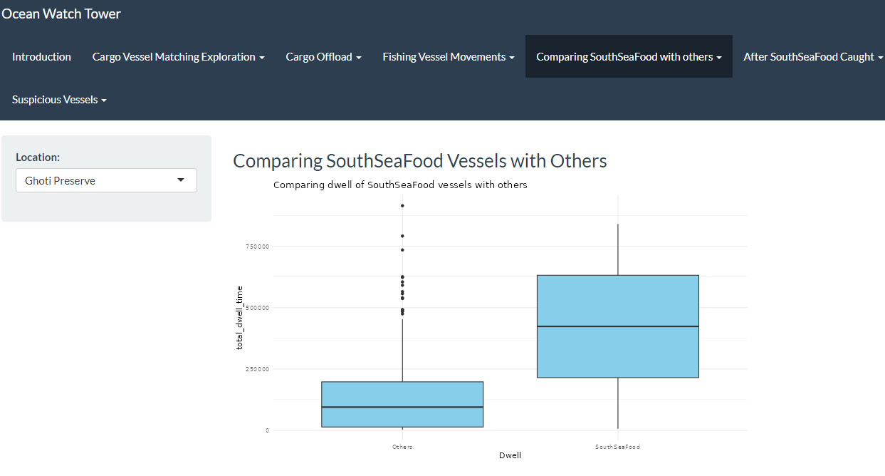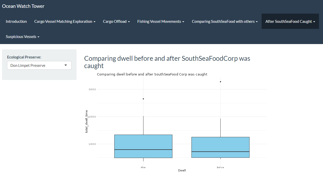 We have also designed visualizations in RShiny to compare dwell times of fishing vessels before and after the capture of SouthSeaFood Corp, which helps to analyze the potential impacts on the fishing patterns of existing companies.